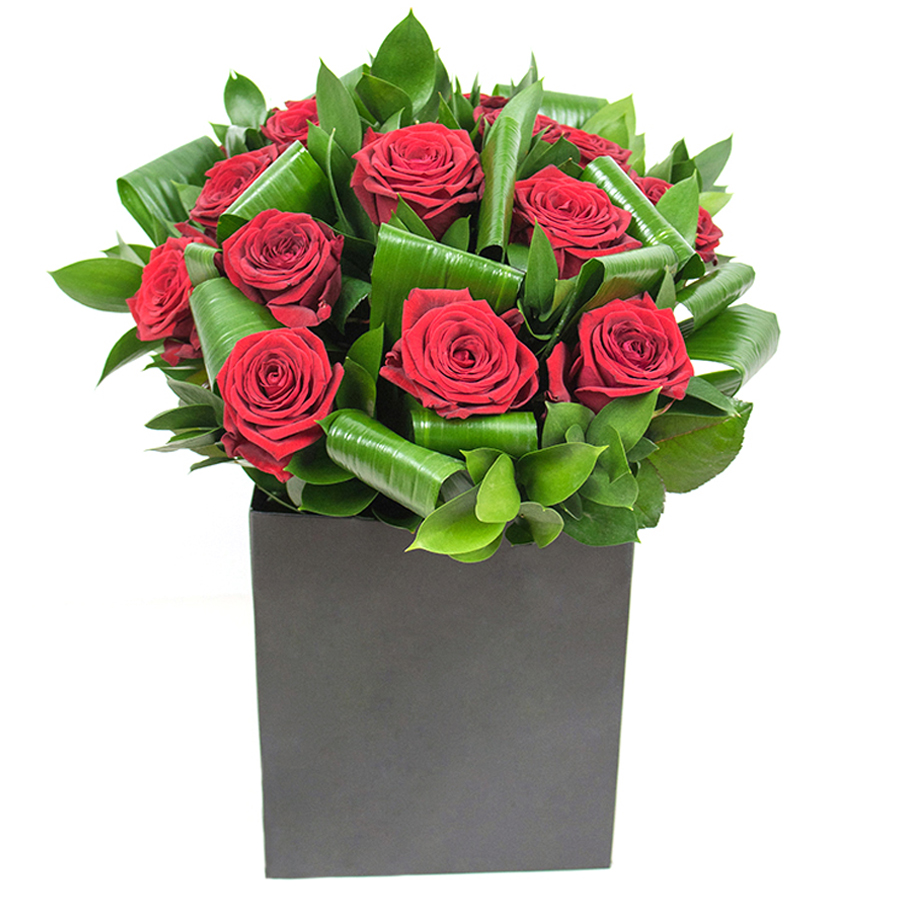 Bring home the radiant beauty of our red roses, enhanced with fresh aspidistra leaves and elegant ruscus. This unique floral arrangement offers luxury and style for any occasion.